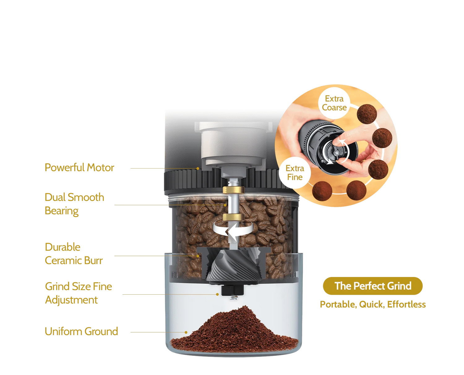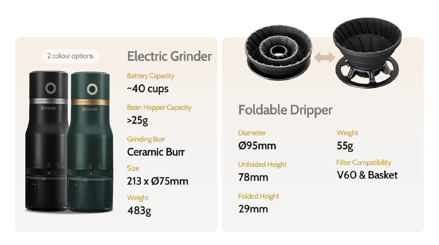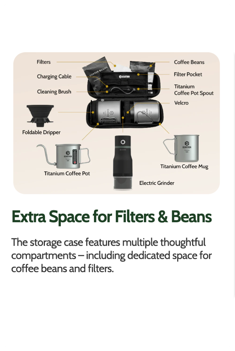 ✅ 4-in-1 Design: Electric Grinder, Foldable Dripper, Titanium Pot & Mug.